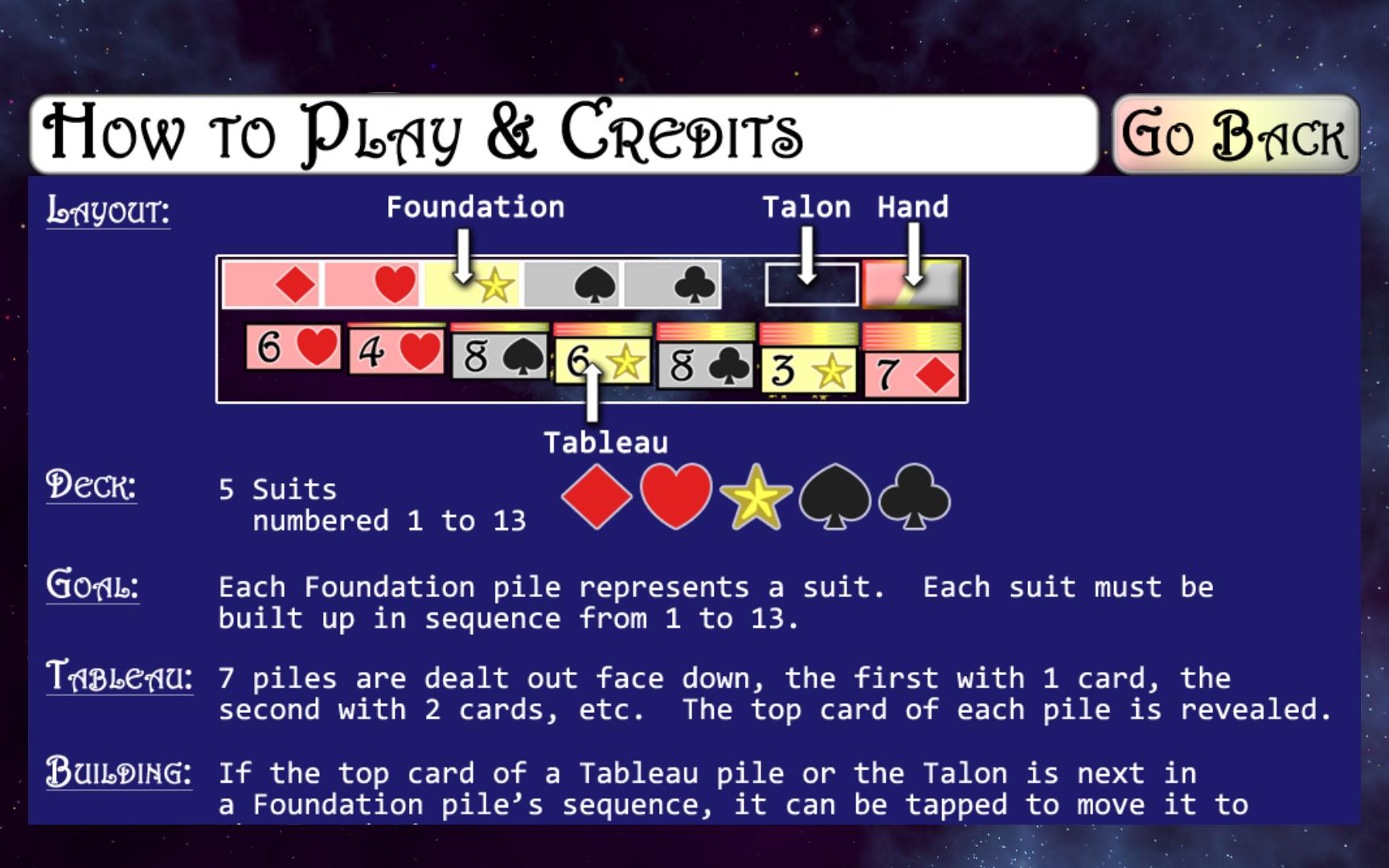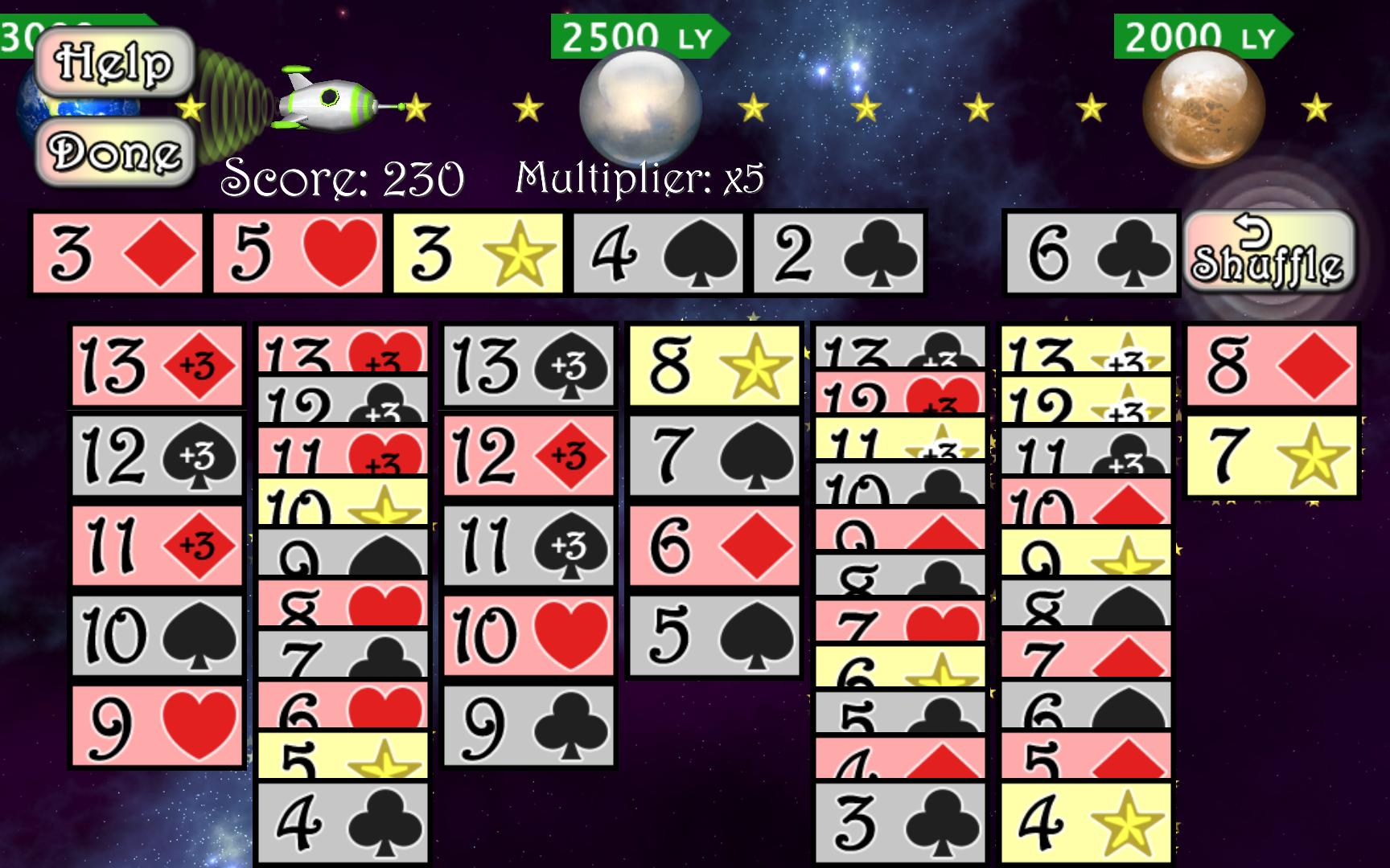新功能:如果最終堆棧合法,您現在可以將堆棧放在另一個堆棧下面的13或星星。例如,想像一下您有一堆(面朝下 + 13顆鑽石)和另一塊(12片-11顆鑽石)。您可以將“ 13鑽石”拖到“(12桿子-11顆鑽石)”堆棧中,它將起作用。這簡化了將“ 12”拖到“ 13”和“ 13”回到空列的兩個步驟過程。
